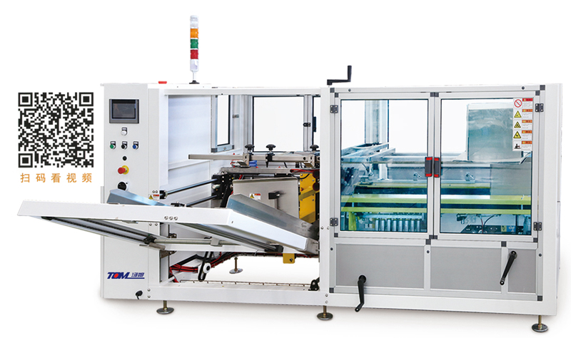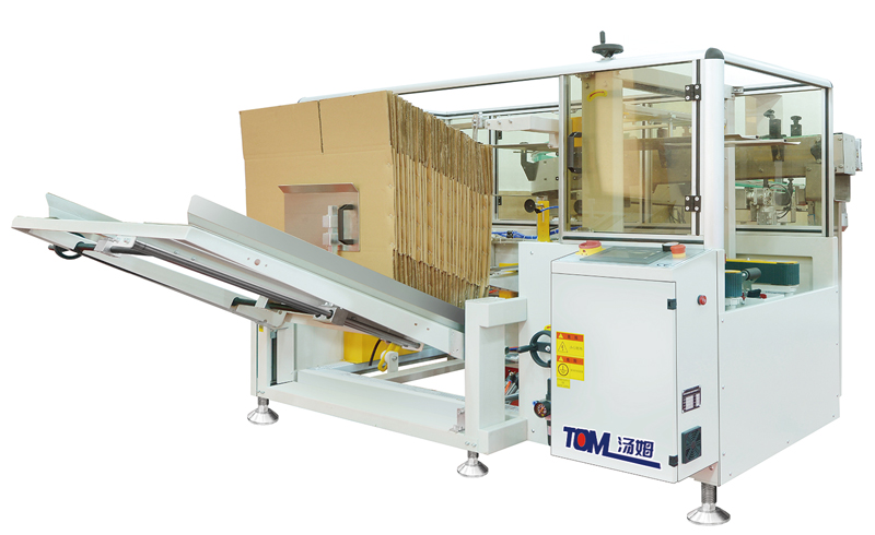 1、本機自動完成開箱、成形、下底折葉折曲,并現時完成下部分膠帶粘貼,將疊成紙板的箱板自動打開,箱子底部按一定程序折合,并用膠帶密封后輸送給裝箱機的專用設備。